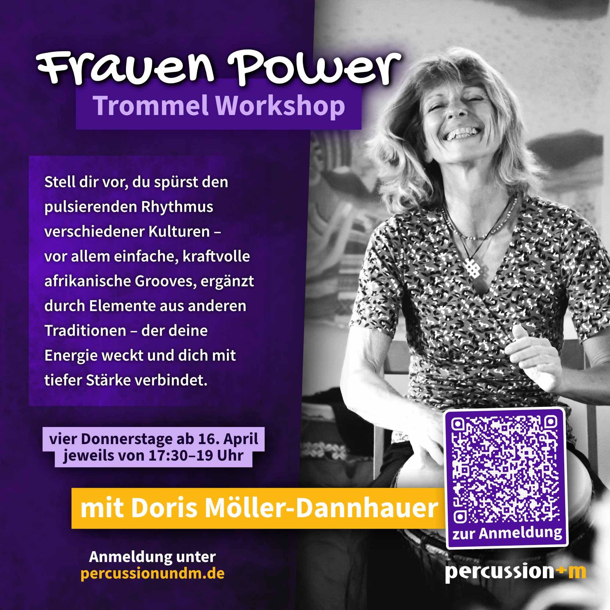 Ein empowernder Trommel Workshop für Frauen. Gemeinsam entwickeln wir entwickeln ein natürliches Gefühl für den Puls mit Musik, bewusster Bewegung, Tanzen und Gesang. Pure Lebensfreude, die den Alltag mit neuer Vitalität bereichert.