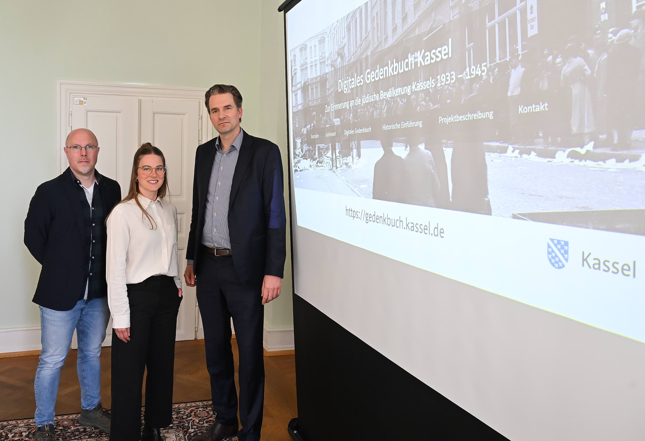 Vorstellung des digitalen Gedenkbuchs (im Bild von links): Dr. Stephan Schwenke (Leiter Stadtarchiv), Anika Manschwetus (Projektleiterin im Stadtarchiv) und Oberbürgermeister Dr. Sven Schoeller. Foto: StadtKassel / Harry Soremski