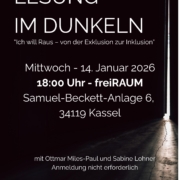 Lesung im Dunkeln aus dem Roman „Ich will Raus – von der Exklusion zur Inklusion“ mit Ottmar Miles-Paul und Sabine Lohner. Am Mittwoch, 14. Januar 2026, 18 Uhr.