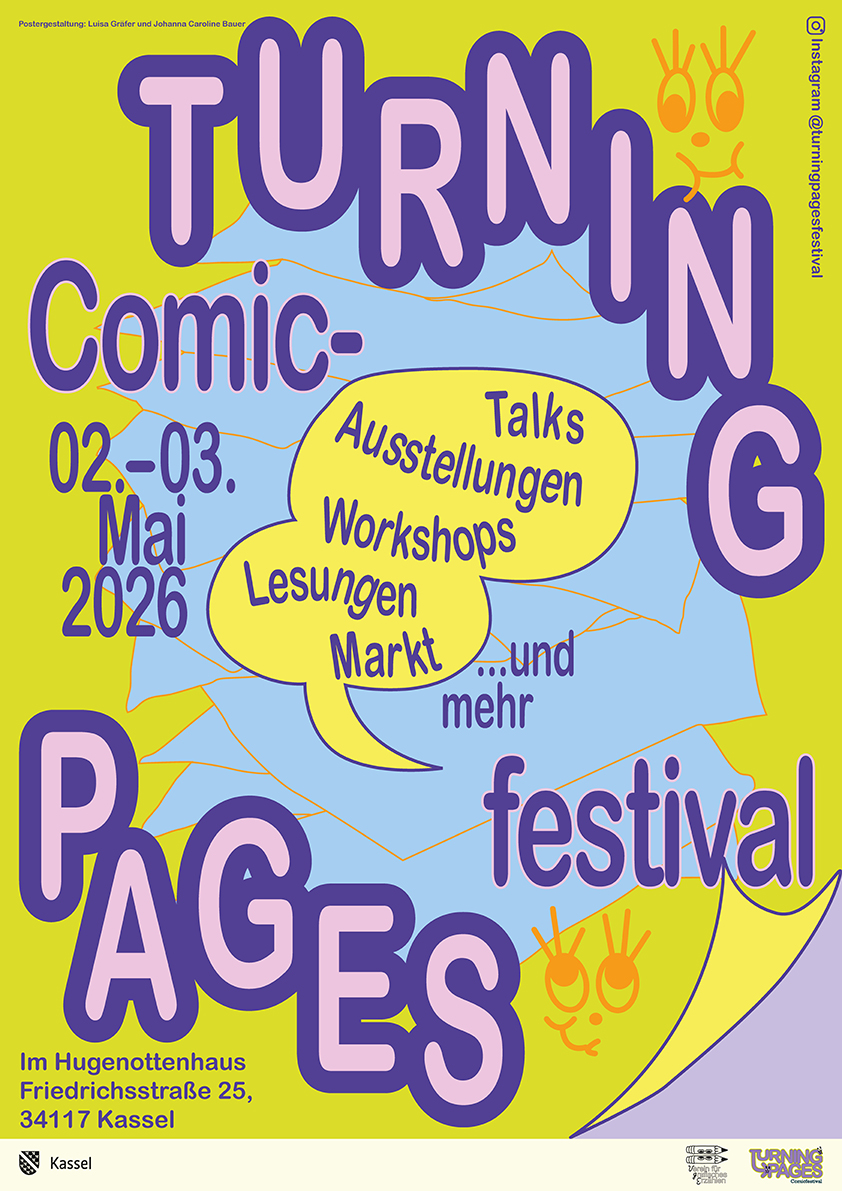 Turning Pages ist ein Comicfestival in Kassel, das in diesem Jahr am 2. und 3. Mai erstmals vom Verein für grafisches Erzählen ausgerichtet wird und im Hugenottenhaus stattfindet. Mit Ausstellungen, Workshops, Lesungen, Talks und einer kleinen Verkaufsmesse möchten wir die Vielfalt der lokalen Szene des grafischen Erzählens einer breiten Öffentlichkeit zugänglich machen.